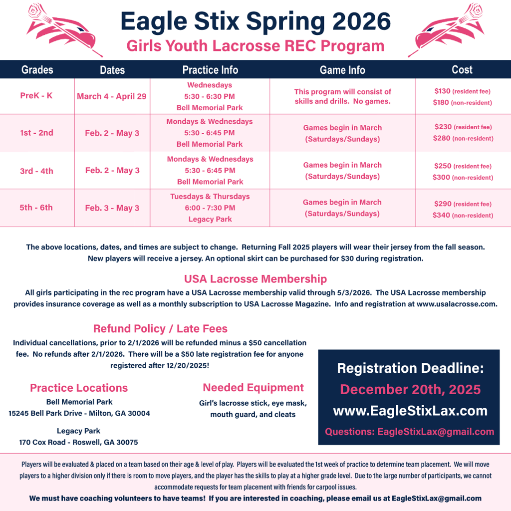 Eagle Stix partners with the City of Milton to run a youth, girls lacrosse rec program. We offer both spring and fall rec seasons. Information will be posted on this page during the registration window. The spring rec season typically has open registration during November/December. The fall rec season typically has open registration during June/July. The rec program is a great way for players to start learning the game of lacrosse and to further develop their game.